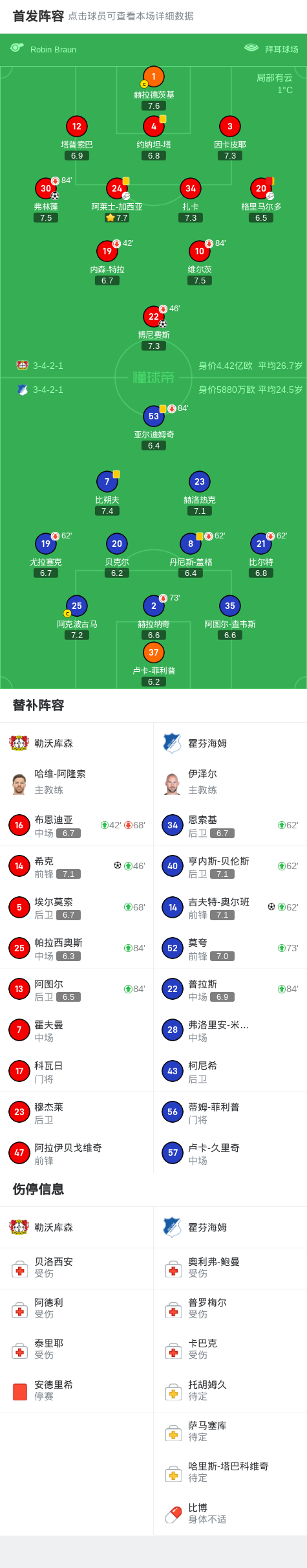 勒沃库森3-1战胜霍芬海姆,德甲20轮胜利赛事汇总